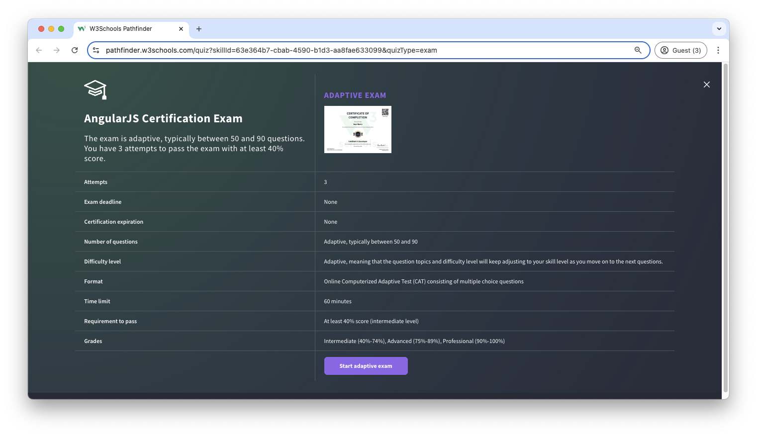 The certification exam is adaptive and graded; students will get a grade from intermediate, advanced to professional.