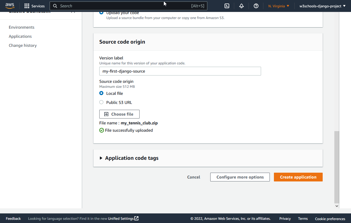 In AWS, navigate to the Elastic Beanstalk application, as we did in the Choose Provider chapter, and click the "Create application" button: