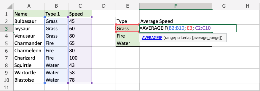 It is typed =AVERAGEIF and has three parts:
