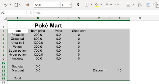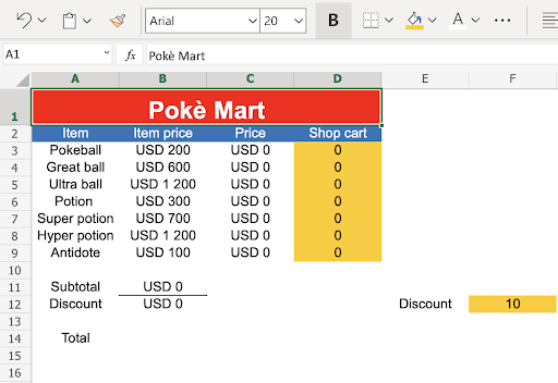 Type Poke Mart in the merged range A1:D1