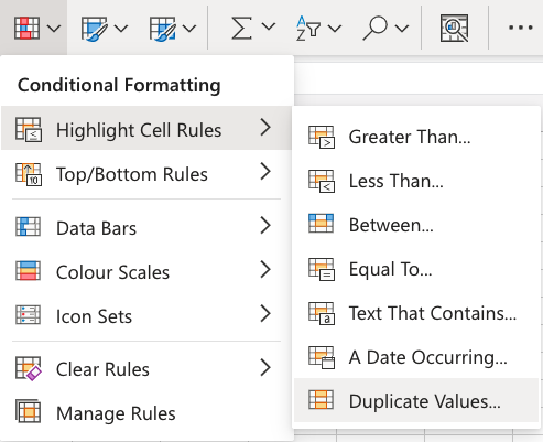 Here is the Highlight Cell Rules part of the conditional formatting menu: