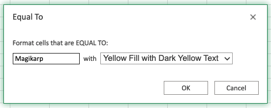 Now, the cells with text values equal to "Magikarp" will be highlighted in yellow: