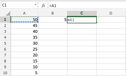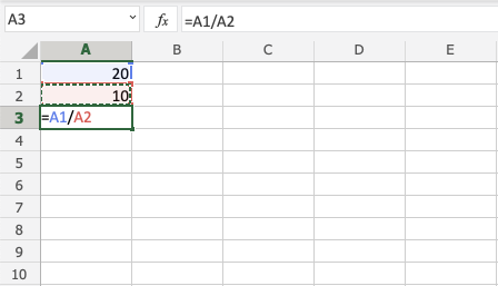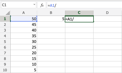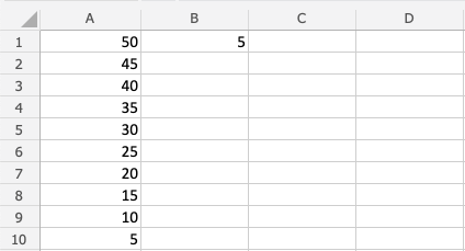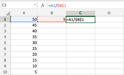 Goob job! You have successfully used absolute reference to divide B1(5) with the range A1:A10.
