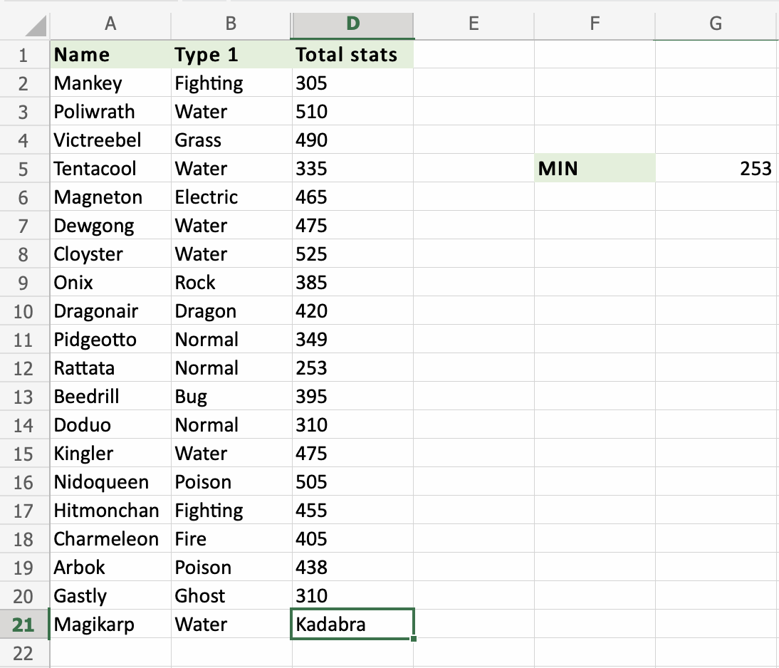 Look at that! The function has successfully found the lowest value, 200. Magikarp has the lowest Total stats of the Pokemons in the range D2:D21.