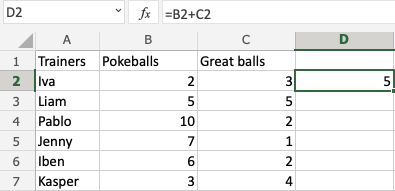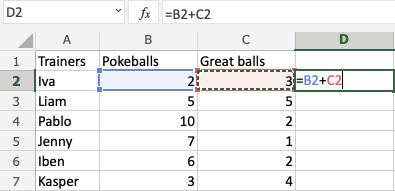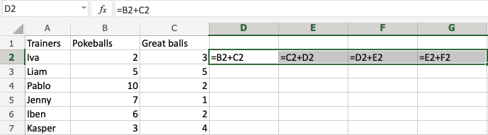 Let's have a look at a relative reference example, helping the Pokemon trainers to count their Pokeballs (B2:B7) and Great balls (C2:C7).
