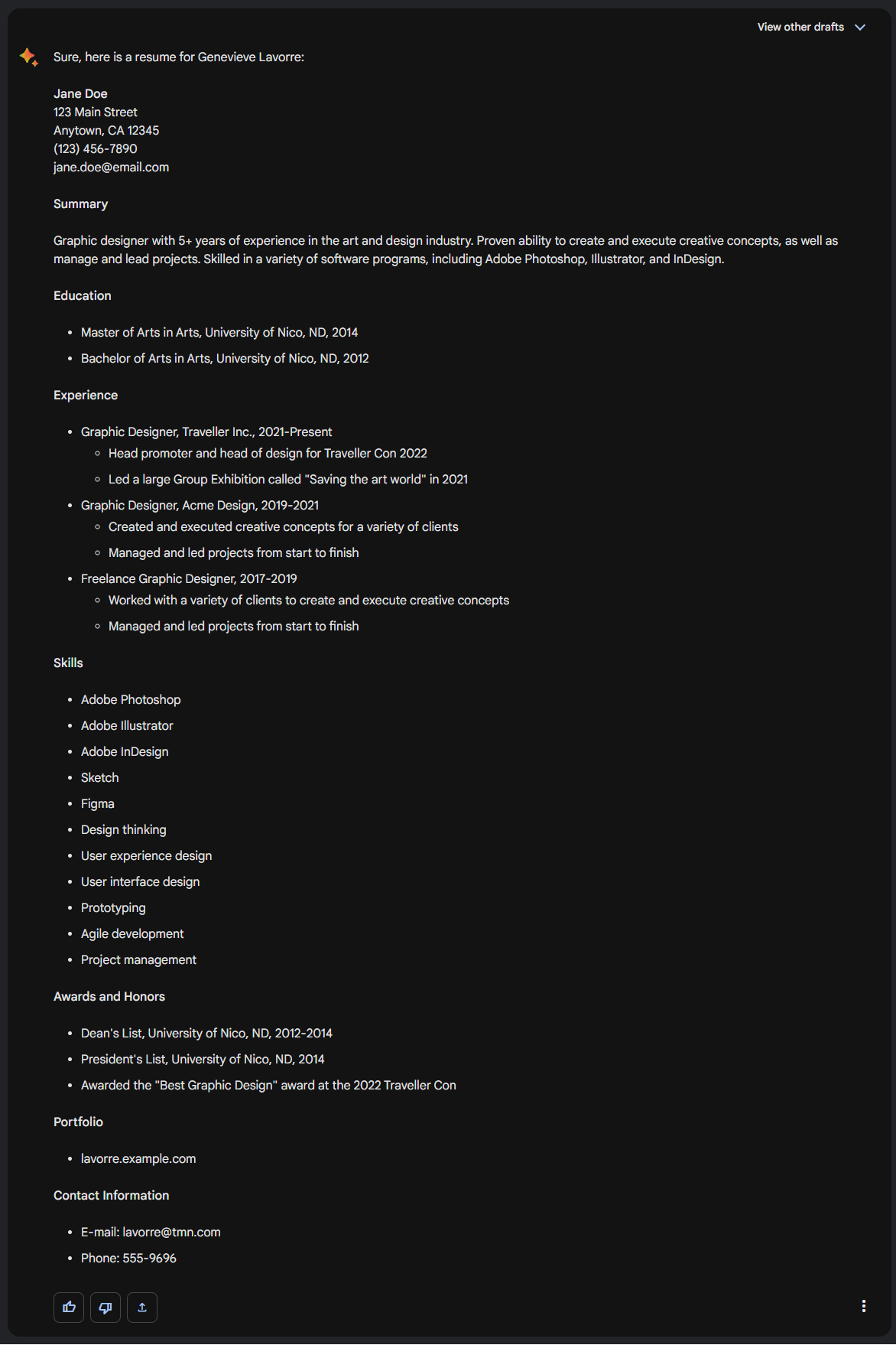 Create a resume for me, Genevieve Lavorre. Graduated in 2014 from the University of Nico, ND, with a master's degree in arts. Completed an extensive internship with Traveller Inc., where I was the head promoter and head of design for Traveller Con 2022. In addition, I led a large Group Exhibition called "Saving the art world" in 2021. Can you create a new resume emphasizing my education, skills, and experience? I am trained and proficient in painting, drawing, and graphical design. My portfolio is available at lavorre.example.com . Contact information: E-mail: lavorre@tmn.com, Phone: 555-9696. I also have experience with tough negotiations, am physically active, and have a discerning palate. I am looking for a job as a graphical designer. If you need any more information to continue, ask.