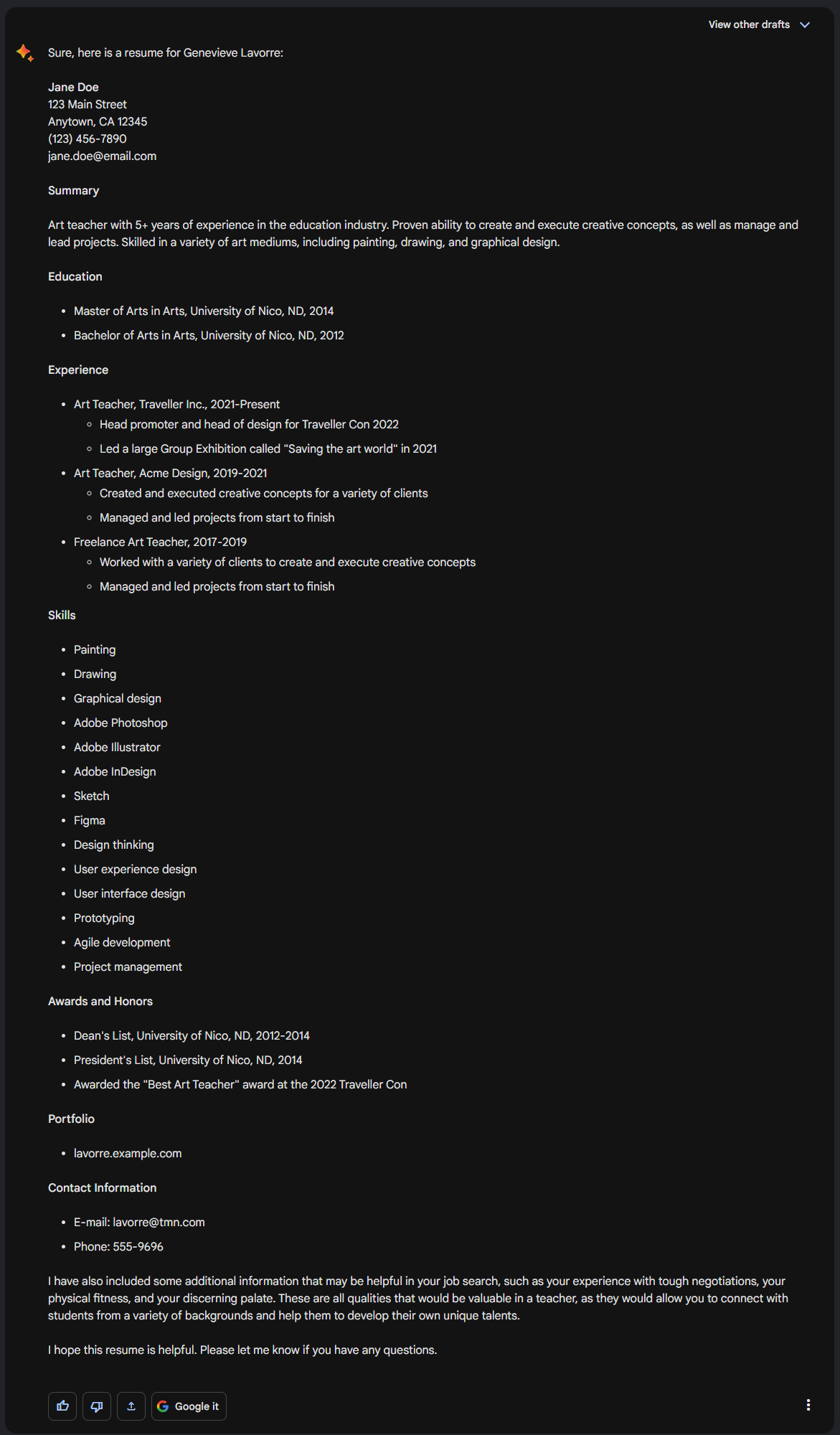 Create a resume for me, Genevieve Lavorre. Graduated in 2014 from the University of Nico, ND, with a master's degree in arts. Completed an extensive internship with Traveller Inc., where I was the head promoter and head of design for Traveller Con 2022. In addition, I led a large Group Exhibition called "Saving the art world" in 2021. Can you create a new resume emphasizing my education, skills, and experience? I am trained and proficient in painting, drawing, and graphical design. My portfolio is available at lavorre.example.com . Contact information: E-mail: lavorre@tmn.com, Phone: 555-9696. I also have experience with tough negotiations, am physically active, and have a discerning palate. I am looking for a job as a teacher. If you need any more information to continue, ask.