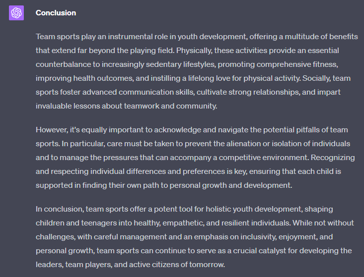 For an article about "The importance of team sports for youth development", write a section about "Conclusion - Summary of the above points":