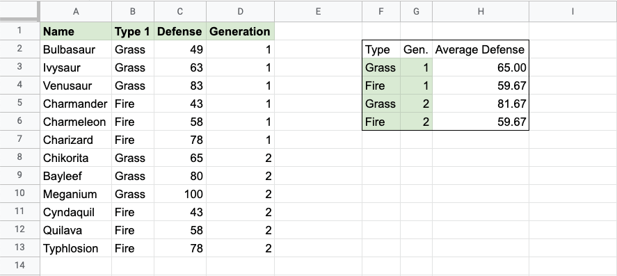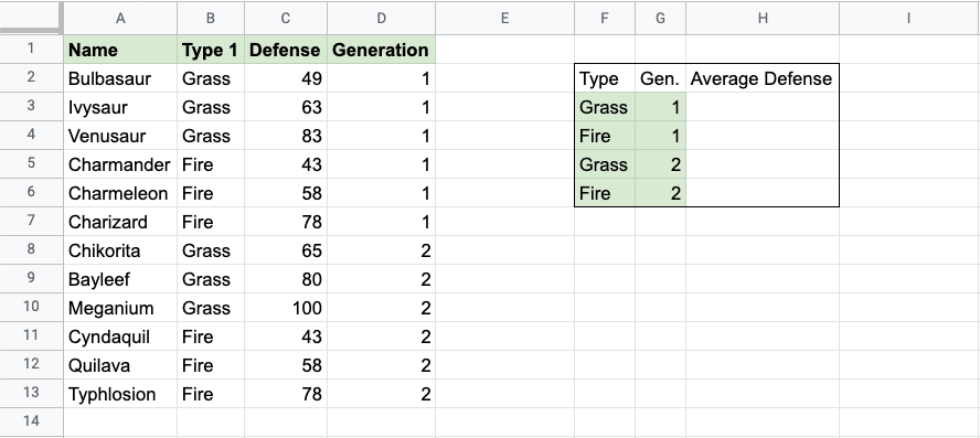 The function now calculates the average defense value of the 1st Generation Grass type Pokemon: Bulbasaur, Ivysaur and Venusaur.