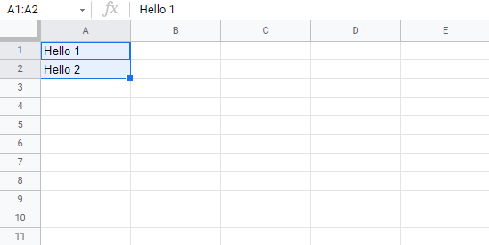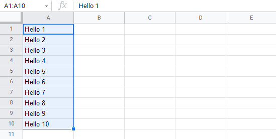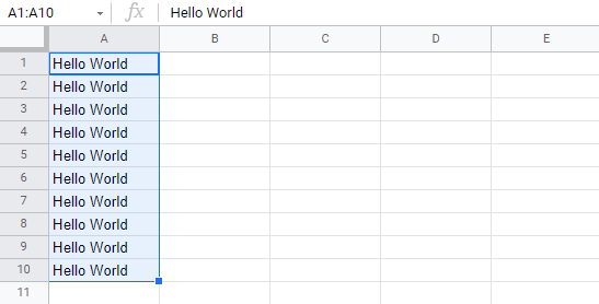 Filling the range A1:A10 creates ten copies of "Hello World":