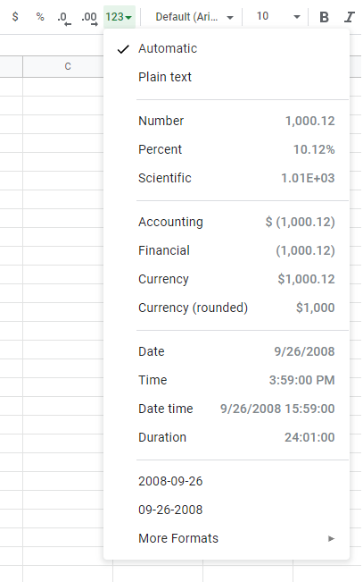 Note: The currency can be changed. For example instead of using $ like in the example you can decide for NOK or EUR. It is changed in the dropdrop menu, clicking the More Formats in the bottom of the menu. Then, clicking on More Currencies.