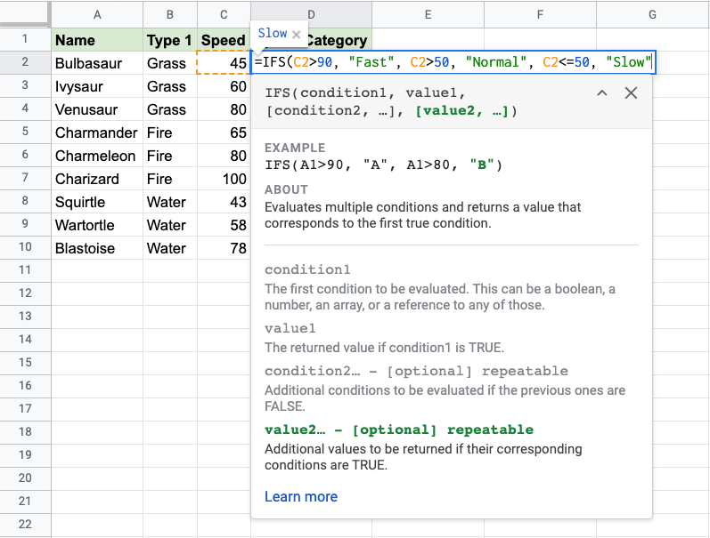 Since the value in cell C2 is "45", the first and second conditions are false, and third condition is true (less than or equal to 50), the function will return "Slow".