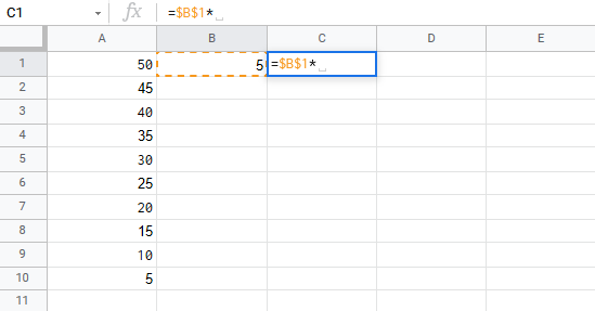 Let's have a look at an example where we multiply B1(5) with the range A1:A10 using absolute reference and the fill function.