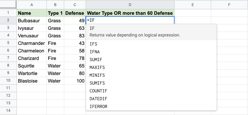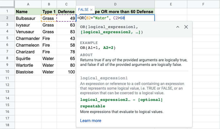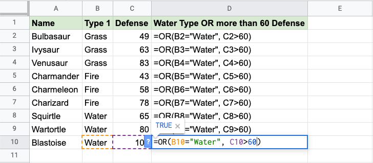 • Wartortle is both Water type and has more than 60 defense, so the function returns "TRUE"