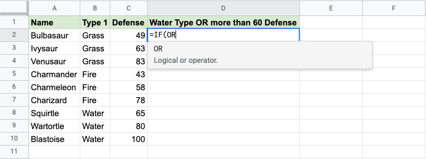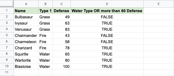 Now, each row has a check for Water Type or Defense greater than 60: