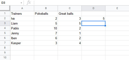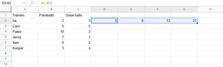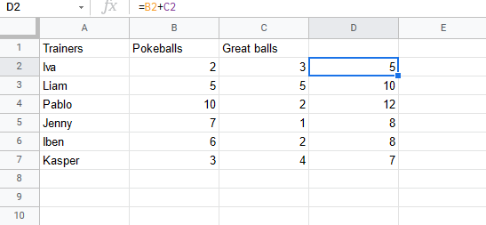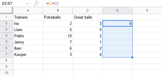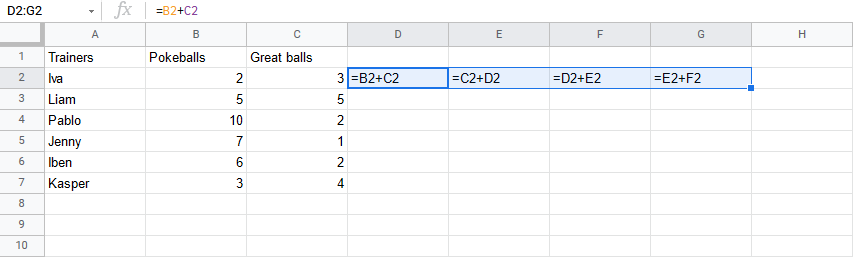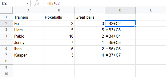 Let's have a look at a relative reference example, helping the Pokemon trainers to count their Pokeballs (B2:B7) and Great balls (C2:C7).