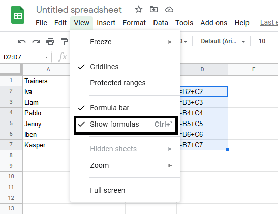 Have a look at the formulas in D2:D7. You can do this by clicking ion the view menu and choosing Show formulas.