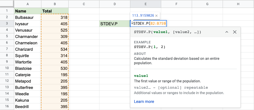 Google Sheets STDEV.P Function