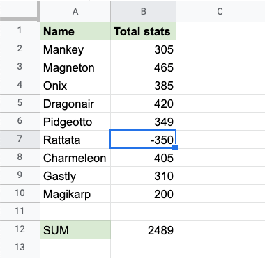 Lets change Rattata's stats to a negative number to see what happens. Type -350 into cell B7: