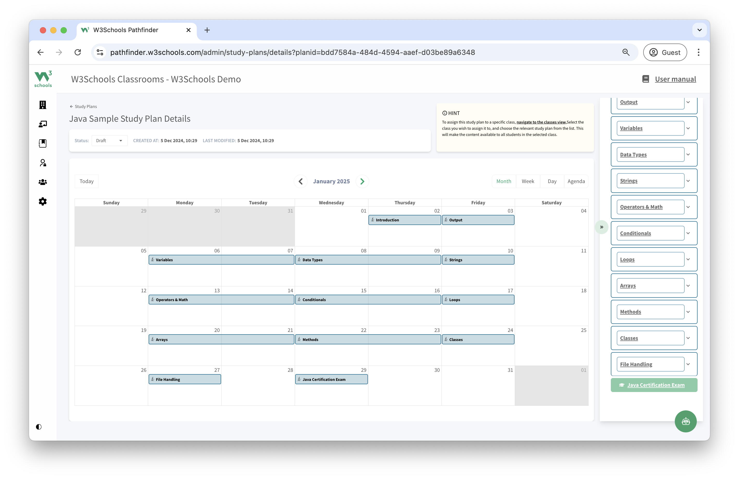 • The Java study plan aligns with the Java Certification Exam.