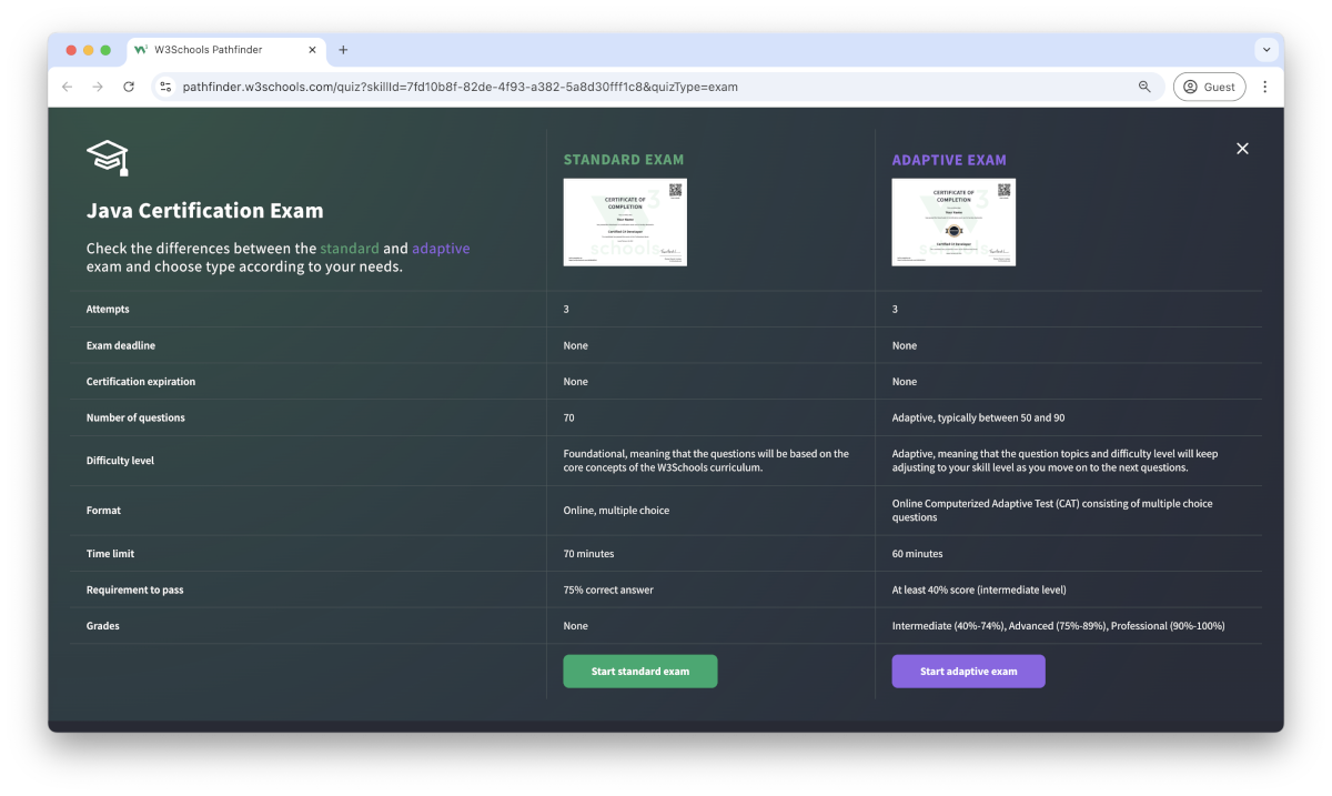 The Java exam is a test that summarizes the W3Schools Java syllabus.