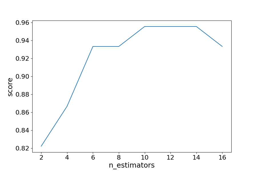By iterating through different values for the number of estimators we can see an increase in model performance from 82.2% to 95.5%. After 14 estimators the accuracy begins to drop, again if you set a different random_state the values you see will vary. That is why it is best practice to use cross validation to ensure stable results.