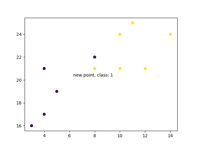 Then, we can use the same KNN object to predict the class of new, unforeseen data points. First we create new x and y features, and then call knn.predict() on the new data point to get a class of 0 or 1: