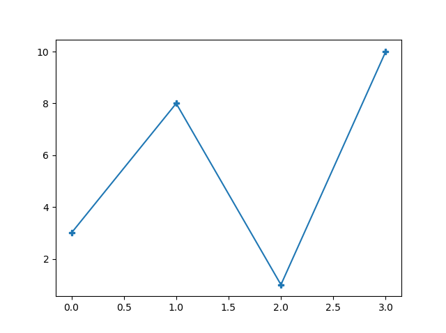 #Three lines to make our compiler able to draw: import sys import matplotlib matplotlib.use('Agg') import matplotlib.pyplot as plt import numpy as np ypoints = np.array([3, 8, 1, 10]) plt.plot(ypoints, marker = 'P') plt.show() #Two lines to make our compiler able to draw: plt.savefig(sys.stdout.buffer) sys.stdout.flush()